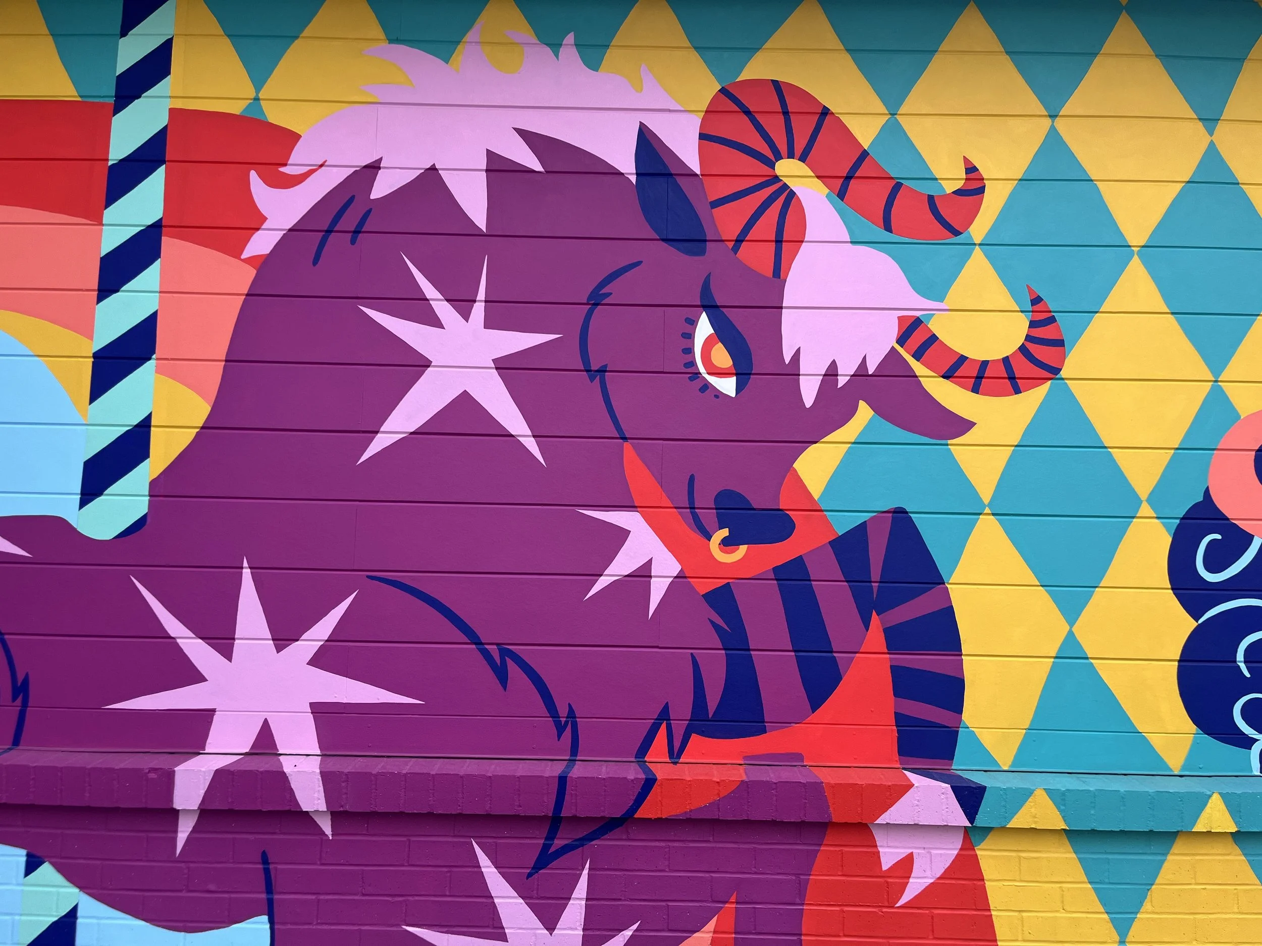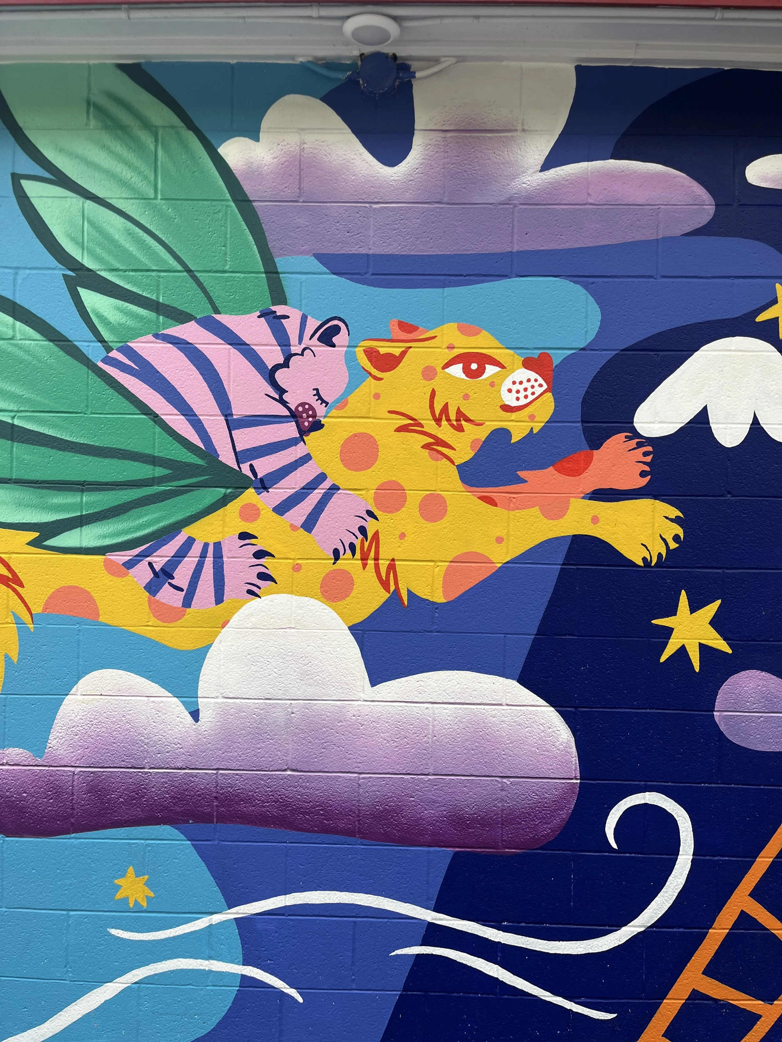 The last wall in this section of the park features a large circus tent with a graphic striped pattern. This piece could work as a photo op with people standing at the tent’s entrance. The sun in the corner of the design has been transformed into a ferris wheel, bringing back a fantastical quality to the park ride, accompanied by a rollercoaster that is cruising through the cotton candy clouds. A flying leopard caring a baby tiger is also featured flying towards the mountain tops to bring back the mural to the original dreamscape of the man on the moon.