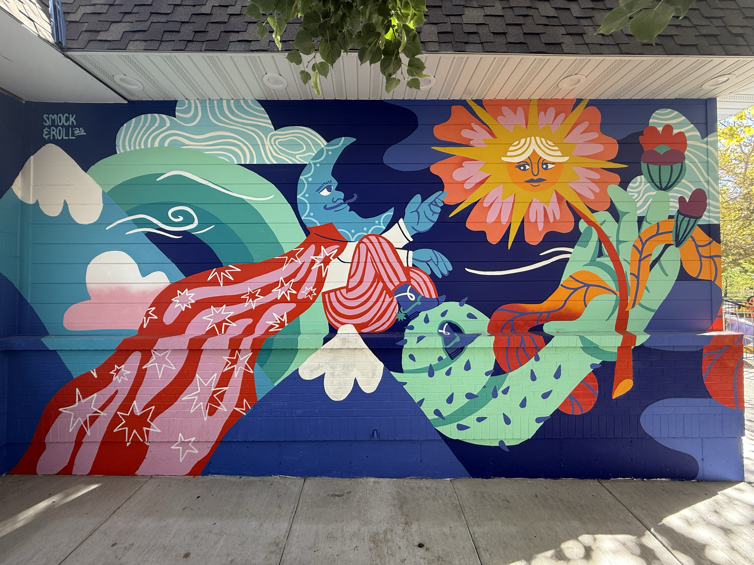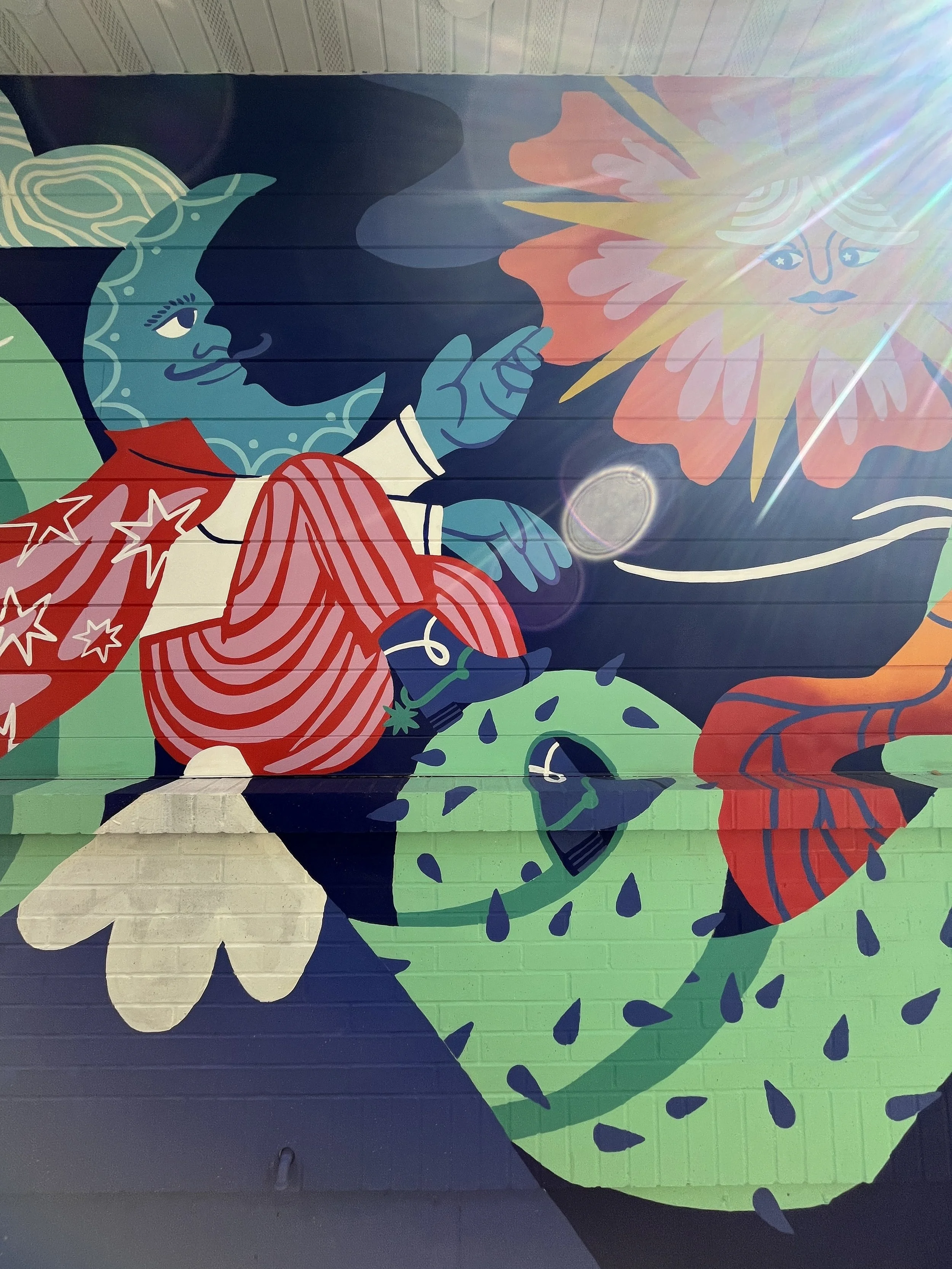 The first wall starts off with a dreamy personification of the Moon and Sun. The moon man is sitting on a mountain top, reaching out to the sun lady, shown in the center of a flower that is being offered by a cactus hand, further pushing the imaginative dialogue.